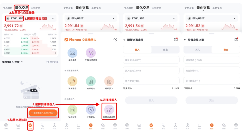 在 Pionex APP 的「交易」介面,選擇「創建機器人」中的「限價止盈止損」,進入策略設置頁面。
