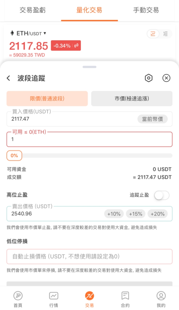波段追踪有兩種模式:限價(普通波段)和市價(極速追漲)兩種,我們先介紹下普通波段的限價模式。