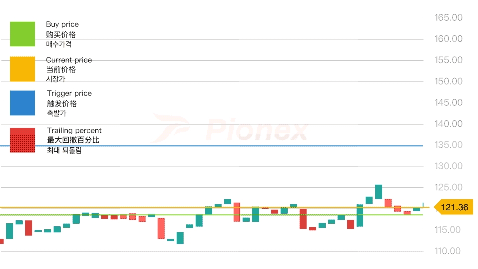 下面的動圖展示的是追踪止盈的運行機制,我們可以看到:當幣價上漲至設定的觸發價格時(134.81),開啟追踪止盈策略;當幣價震盪上漲時,只要幣價與觸發策略後的幣價最高點的差距<設定的回撤比例(5%),訂單都可以繼續運行,讓你賺取上漲趨勢的利潤,直到回撤達到設定值時,止盈就會被觸發(154.03),讓你不用時時刻刻盯盤,又能輕鬆逃頂!