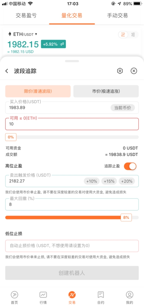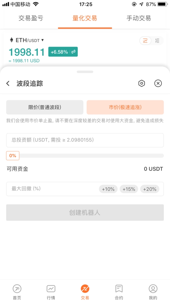 极速追涨相对简单,输入投资金额和最大回撤值然后就可以成功开启机器人,但风险较大,可能出现市价2000买入,2001后开始回撤,达到回撤百分比后,把币卖出成USDT导致亏损。所以使用过程需要谨慎,适合大跌行情。