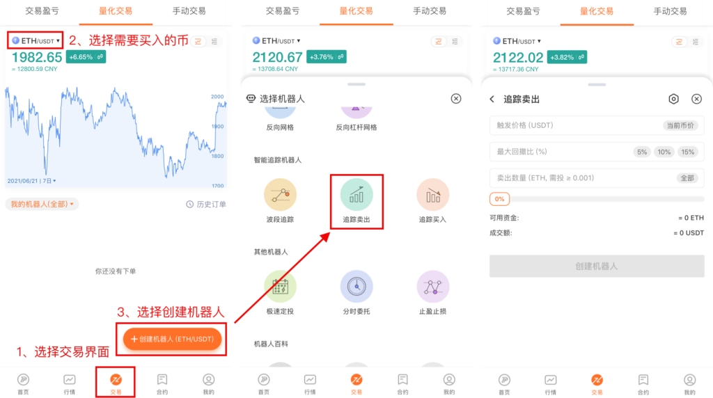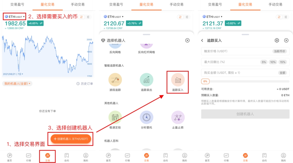 创建追踪买入机器人,选择ETH/USDT交易对,当前ETH的价格为2122USDT,预期2000USDT开始买入,设置触发价为2000USDT,设置5%的最大回撤,买入数量为1个ETH,完成设置后,机器人订单开始监控币价,当ETH价格到2000USDT时,机器人开始监控币价,ETH价格持续下跌直到 1800 USDT 后,如果回落超过最大回撤值 5%,则机器人将会于 1890 USDT 以市价买入 ETH,同时结束追踪买入机器人。