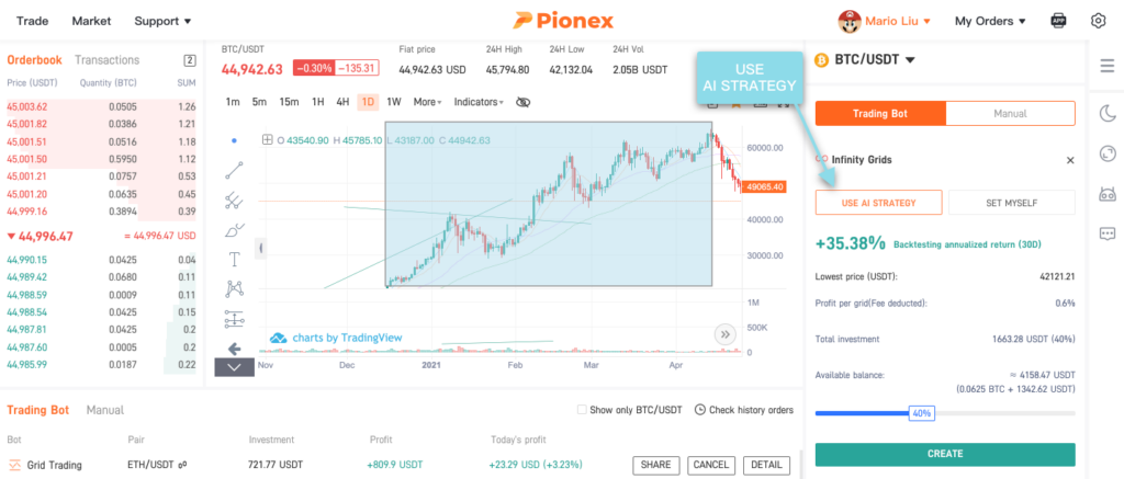 If you choose “Use AI Strategy”, Pionex AI Advisor will suggest you a set of parameters. The parameters are calculated from backtesting the last 30-Days of market data. You’ll see the recommended “Lower Limit” for the bot and the “Profit per Grid” will be fixed at 0.6%. All you’ll need to do is to use the slider to choose how much of your funds you want to use for the Infinity Grid Bot.
