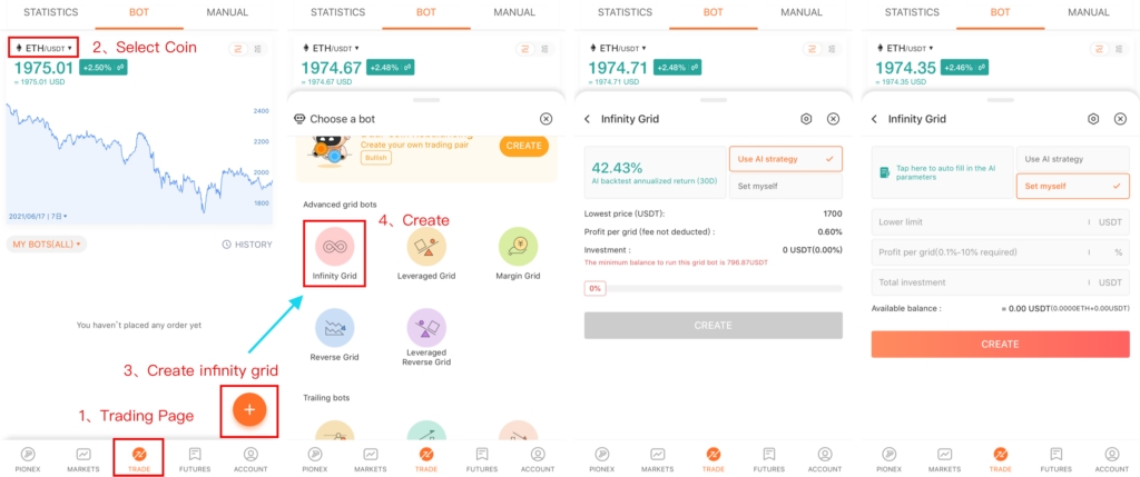 If you wanna create Infinity Grid Bot on Pionex app, Just follow above picture, tap “TRADE”, Select the coin you want, and choose Infinity Grid Bot, set parameters. Finally just tap “CREATE” , then your Infinity Grid Bot starts.