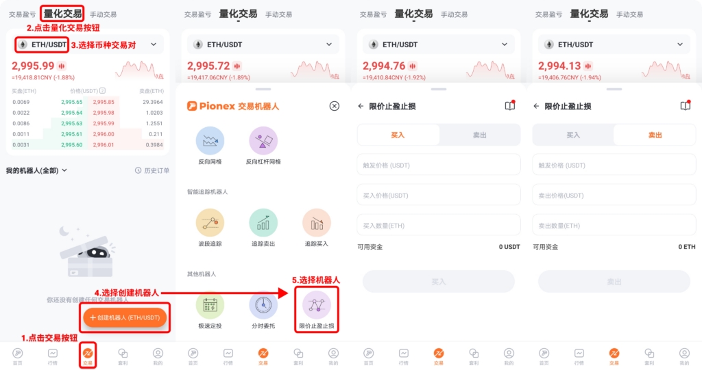 在 Pionex APP的「交易」界面,选择「创建机器人」中的「限价止盈止损」,进入策略设置页面。